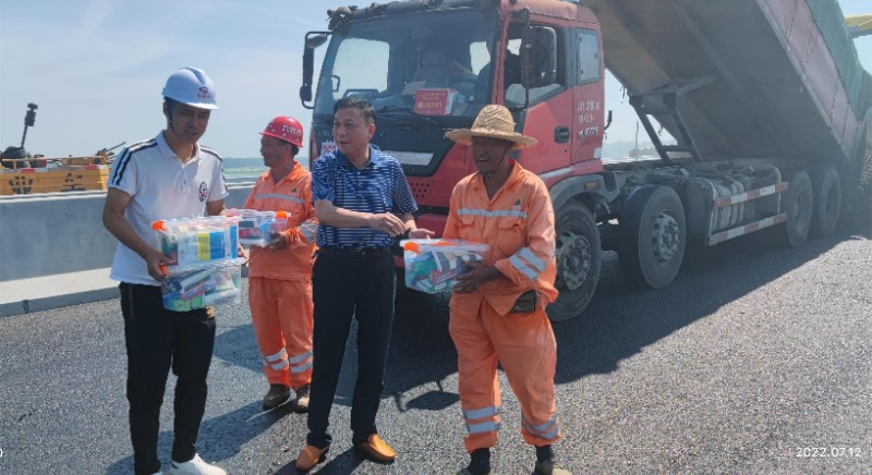 近日持續(xù)高溫、烈日炎炎,S325六安馬頭至長(zhǎng)集段新建工程奮戰(zhàn)正酣。項(xiàng)目建設(shè)單位領(lǐng)導(dǎo)關(guān)心一線施工人員的身心健康,7月12日上午,市交通運(yùn)輸局黨組成員、總工程師程本文等一行到S325項(xiàng)目開(kāi)展“夏日送清涼”慰問(wèn)活動(dòng),給奮戰(zhàn)在高溫一線的施工人員送來(lái)防暑降溫用品,為炎炎夏日下的施工人員帶來(lái)一絲“清涼”。