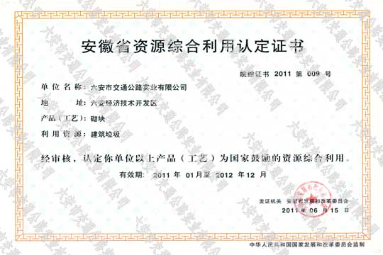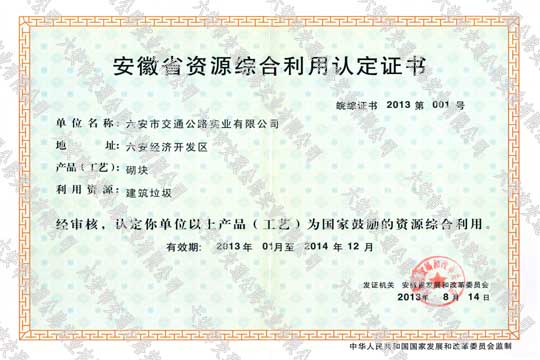 安徽省資源綜合利用認定證書