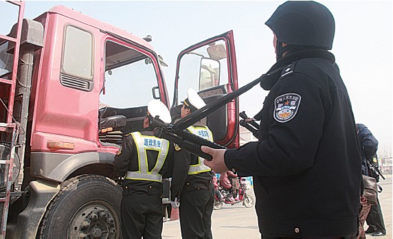 楊小店治超站現(xiàn)場:“治超”用上了防暴槍械